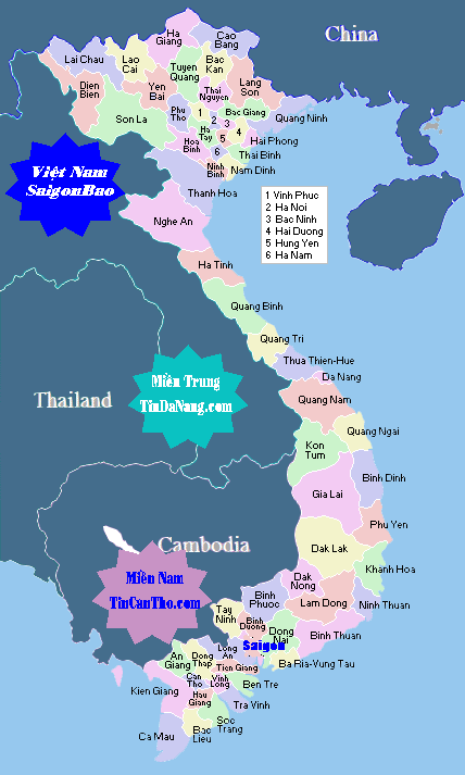 Lai Chau Lao Cai Ha Giang Cao Bang Lang Son Quang Ninh Tuyen Quang Bac Kan Thai Nguyen Bac Giang Yen Bai Phu Tho Son La Vinh Phuc Ha Noi Bac Ninh Hai Duong Hai Phong Hung Yen Ha Nam Ha Nam Hoa Binh Ha Tay Nam Dinh Thai Binh Thanh Hoa Ninh Binh Nghe AN Ha Tinh Quang Binh Quang Tri Thua Thien - Hue Da Nang Quang Nam Quang Ngai Kon Tum Gia Lai Phu Yen Dak Lak Khanh Hoa Ninh Thuan Dak Nong Lam Dong Binh Thuan Binh Phuoc Dong Nai Binh Duong Tay Ninh Saigon Ba Ria Vung Tau Long An Tien Giang Ben Tre Tra Vinh Vinh Long Dong Thap An Giang Can Tho Hau Giang Soc Trang Bac Lieu Kien Giang Ca Mau